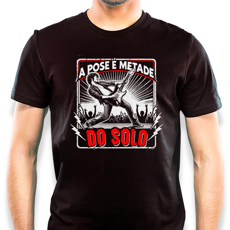 A pose é metade do solo! Camiseta 100% algodão premium, com silk de alta qualidade e costura reforçada, feita para guitarristas que vivem o rock no palco e na vida!