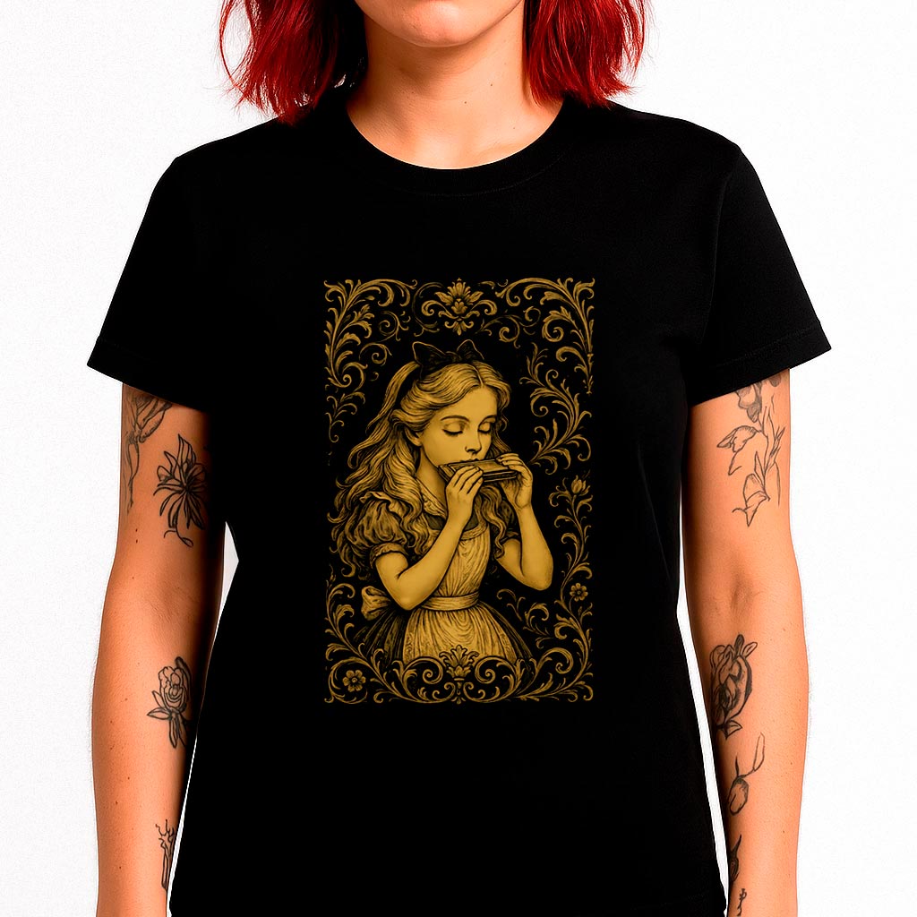 A estampa “Alice Plays Harmonica” é uma viagem sonora e visual. Um encontro inusitado entre fantasia e música de alma. Produzida em malha premium 100% algodão, com caimento perfeito e estampa resistente, essa camiseta é pra quem curte quebrar padrões com estilo.