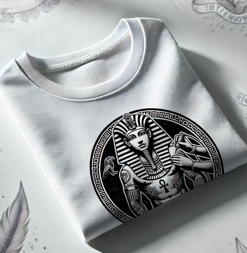 Se os antigos faraós já eternizavam sua história em hieróglifos, imagina se tivessem tatuagens? Nesta estampa exclusiva, um faraó recebe sua própria marca na pele, unindo o misticismo do Egito Antigo com a arte atemporal da tatuagem. Feita em malha premium 100% algodão, essa camiseta oferece conforto, durabilidade e um design único, perfeito para quem carrega a história e a arte no corpo. Garanta a sua agora! 👁️⚡