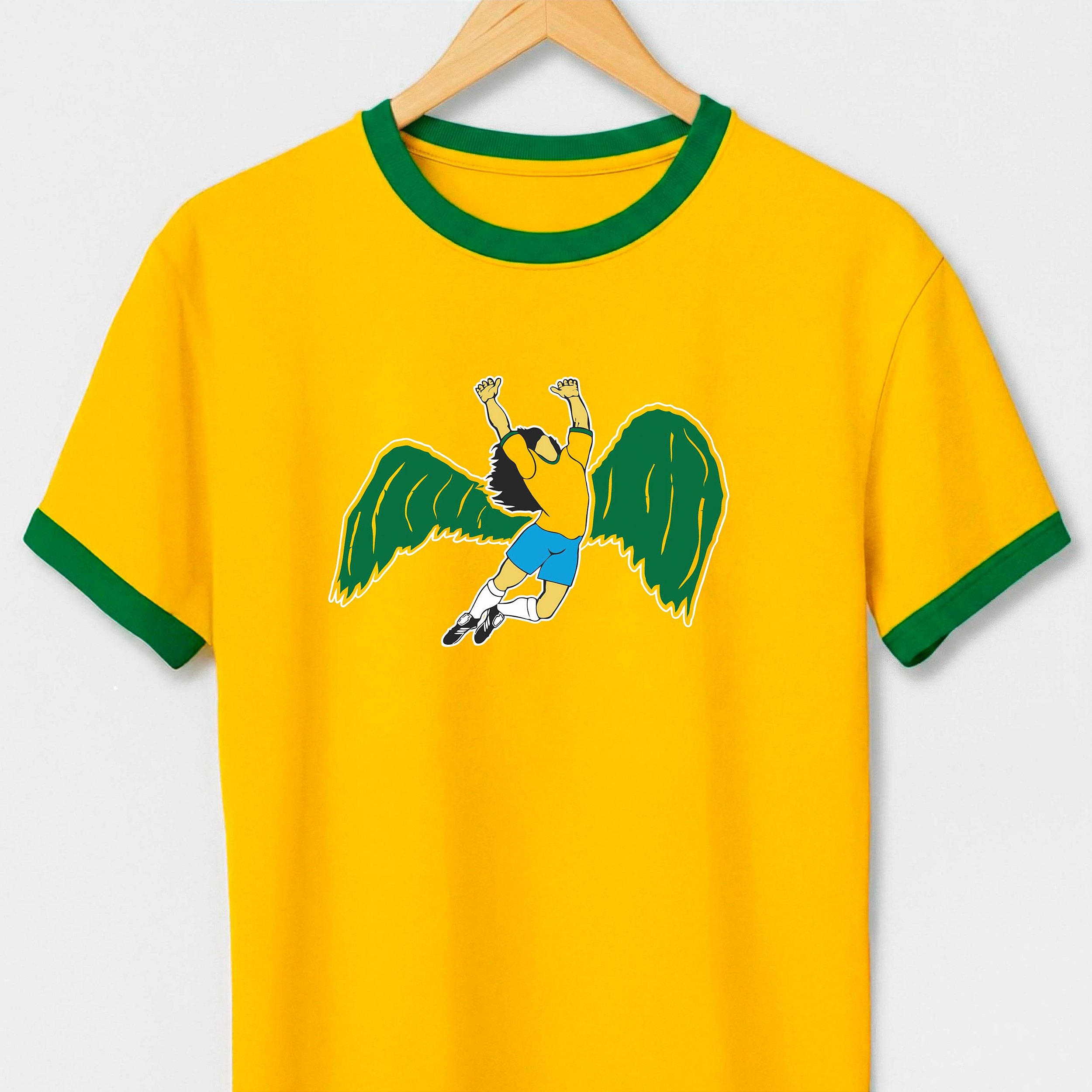 Camiseta Led Anjo Vede e Amarelo na cor amarela com gola e punhos verdes com mangas curtas premium
