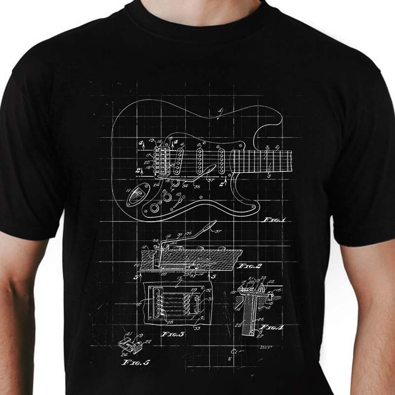Camiseta que mostra o desenho da patente da guitarra Stratocaster. Camiseta 100% Algodão com estampa com silk.