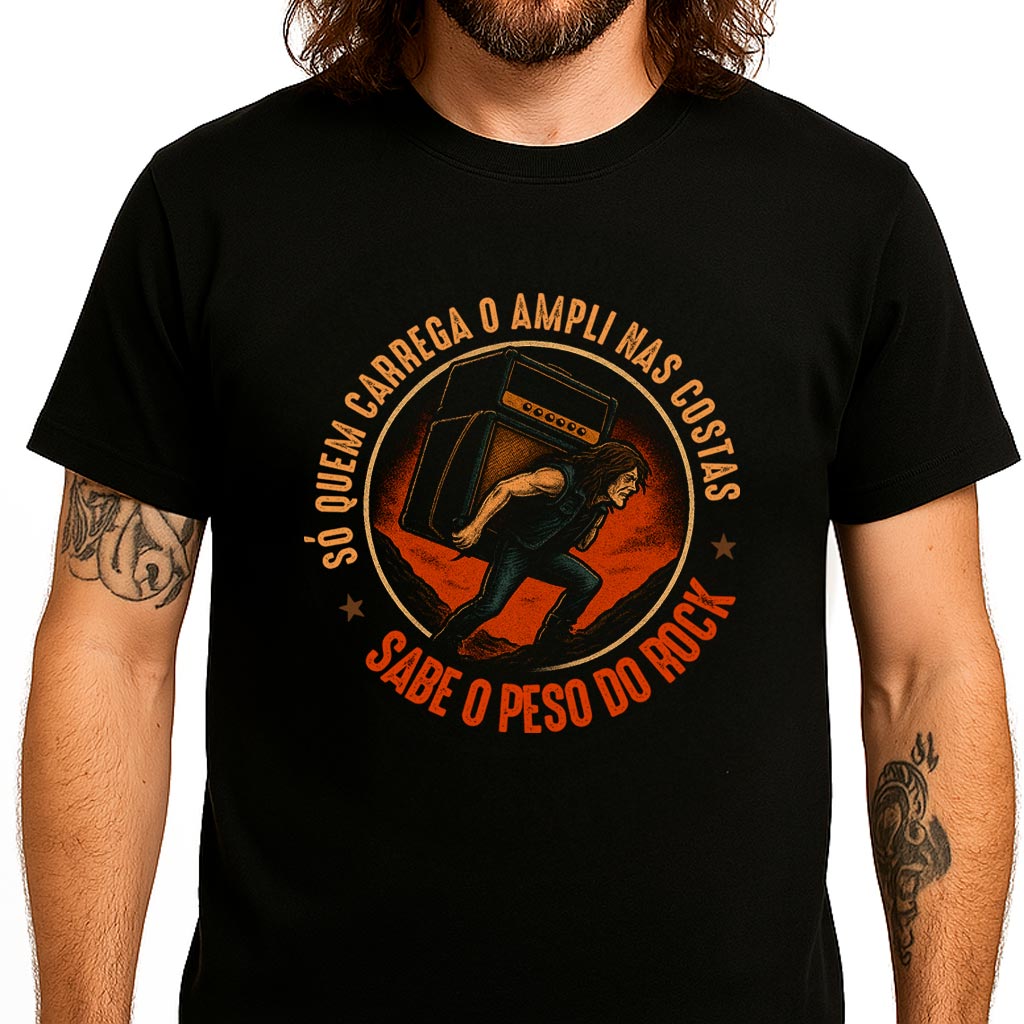 A camiseta “Só quem carrega o ampli nas costas sabe o peso do rock” é uma homenagem aos verdadeiros heróis da estrada: os músicos que montam, desmontam, afinam, testam e carregam tudo — inclusive a alma — pra fazer o show acontecer.