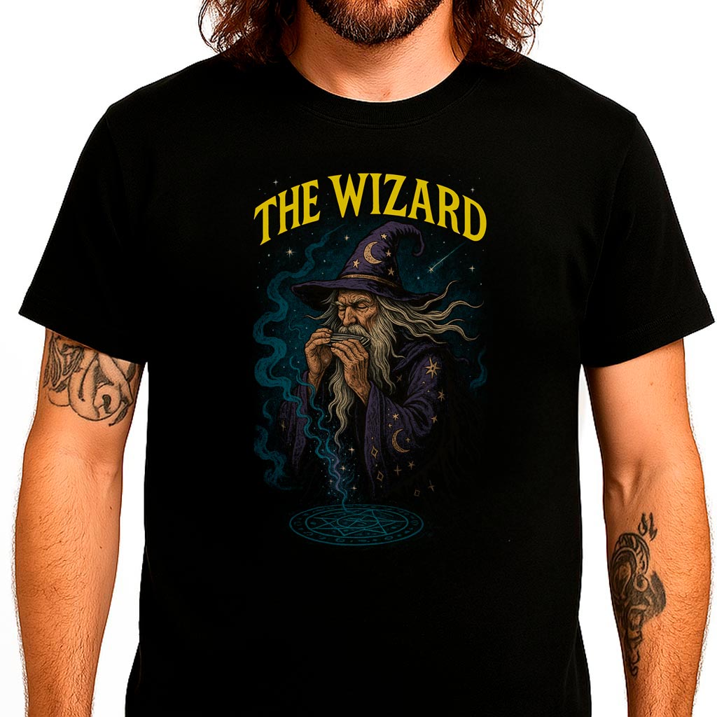 Ele atravessou terras sombrias, enfrentou monstros, e agora surge em uma nova missão: invocar o poder do blues. Com barba longa, túnica estrelada e um olhar ancestral, o mago da estampa “The Wizard” parece saído de uma saga épica — e é mesmo. Inspirado visualmente em Gandalf, e musicalmente na icônica faixa do Black Sabbath, esse bruxo não solta raios: ele sopra uma gaita e faz o som vibrar no ar como magia negra.