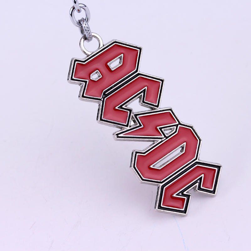 Chaveiro em metal com o formato da logo da banda AC/DC.